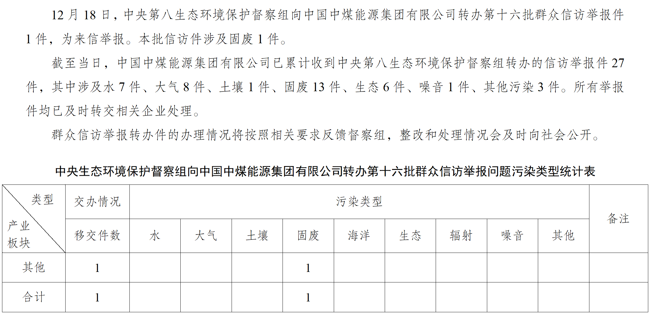 中央第八生態(tài)環(huán)境保護(hù)督察組向中國中煤能源集團(tuán)有限公司轉(zhuǎn)辦第十六批群眾信訪舉報件